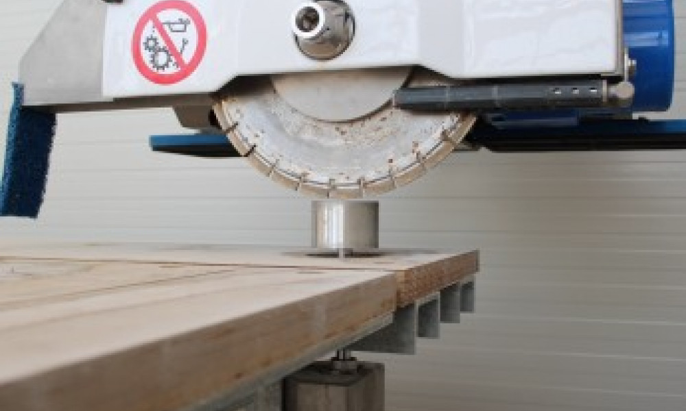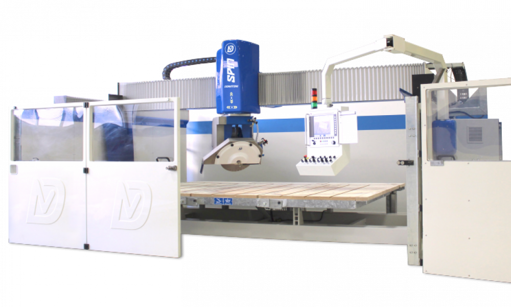 Máquina para corte de chapas em mármore, granito e aglomerados com espessura até 200 mm com disco de 625 mm de diâmetro. Versão frame (monobloco) – estrutura monobloco em aço, com tratamento galvanizado, completa com banco rebatível de 0° a 85° hidráulico e plano revestido a madeira.