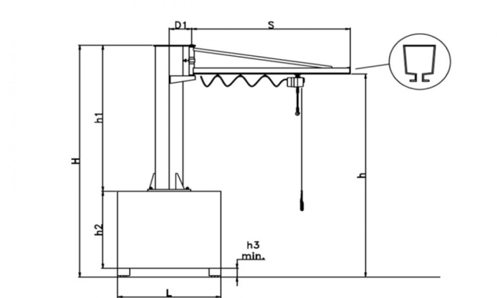Fornecido com: coluna, braço rotativo com sistema de travagem automática, carro manual para guincho, sistema eléctrico com cabo liso e suporte de cabo em plástico, pintura anti-corrosão e duas de mãos de esmalte, base para enchimento com betão.