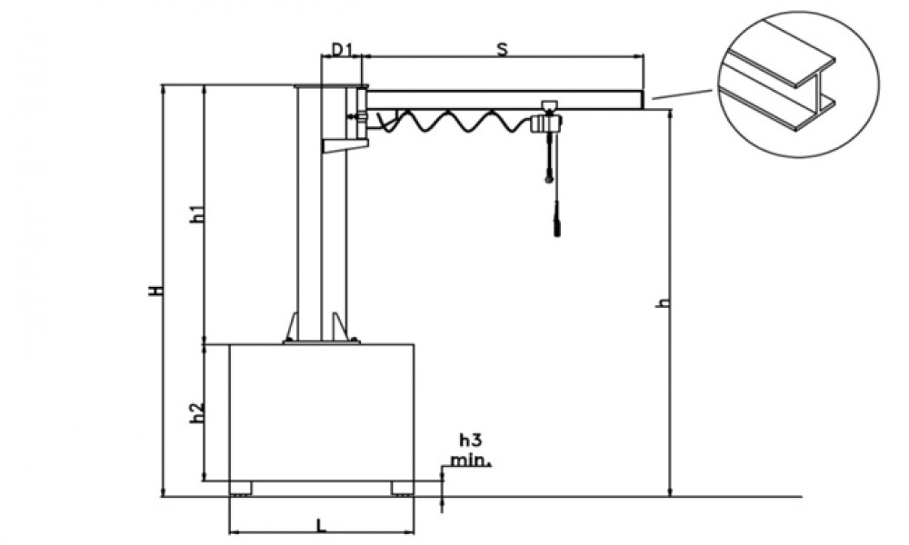 Fornecido com coluna, braço rotativo com sistema de travagem automática, sistema eléctrico com cabo liso e suporte de cabo em plástico, pintura anti-corrosão e duas de mãos de esmalte, base para enchimento com betão.