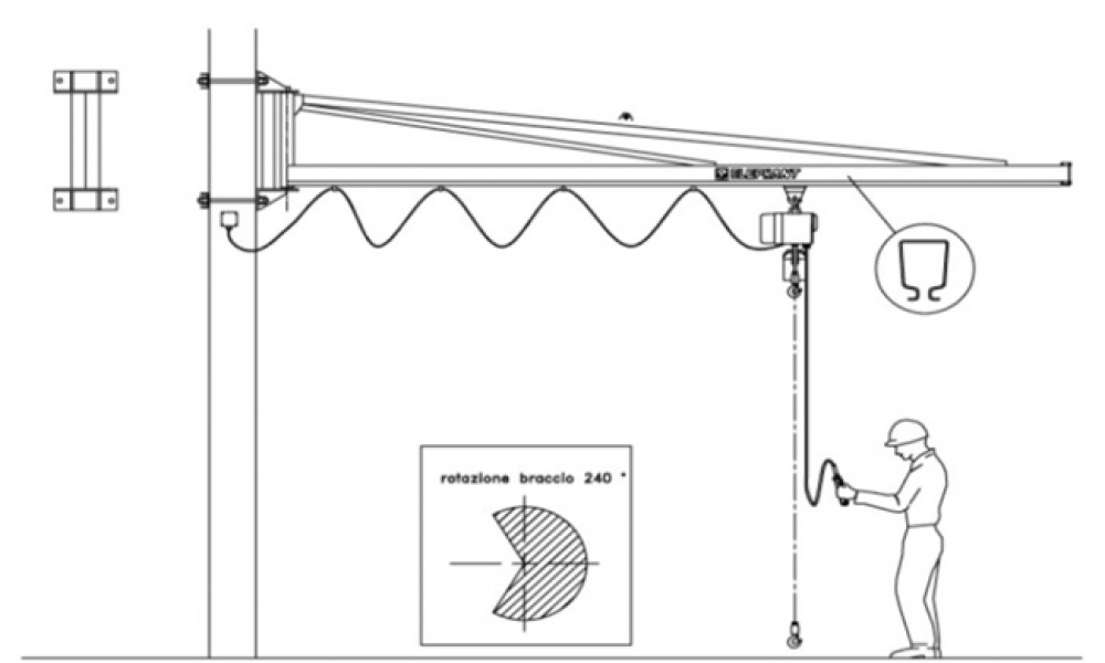 Fornecido com: coluna, braço rotativo com sistema de travagem automática, carro manual para guincho, sistema eléctrico com cabo liso e suporte de cabo em plástico, pintura anti-corrosão e duas de mãos de esmalte.